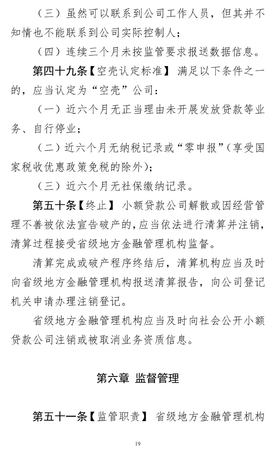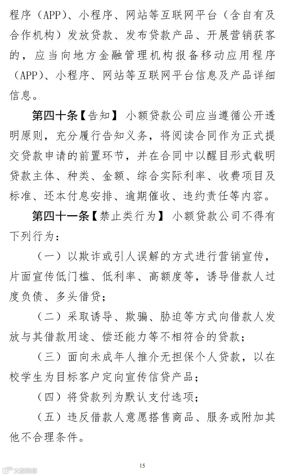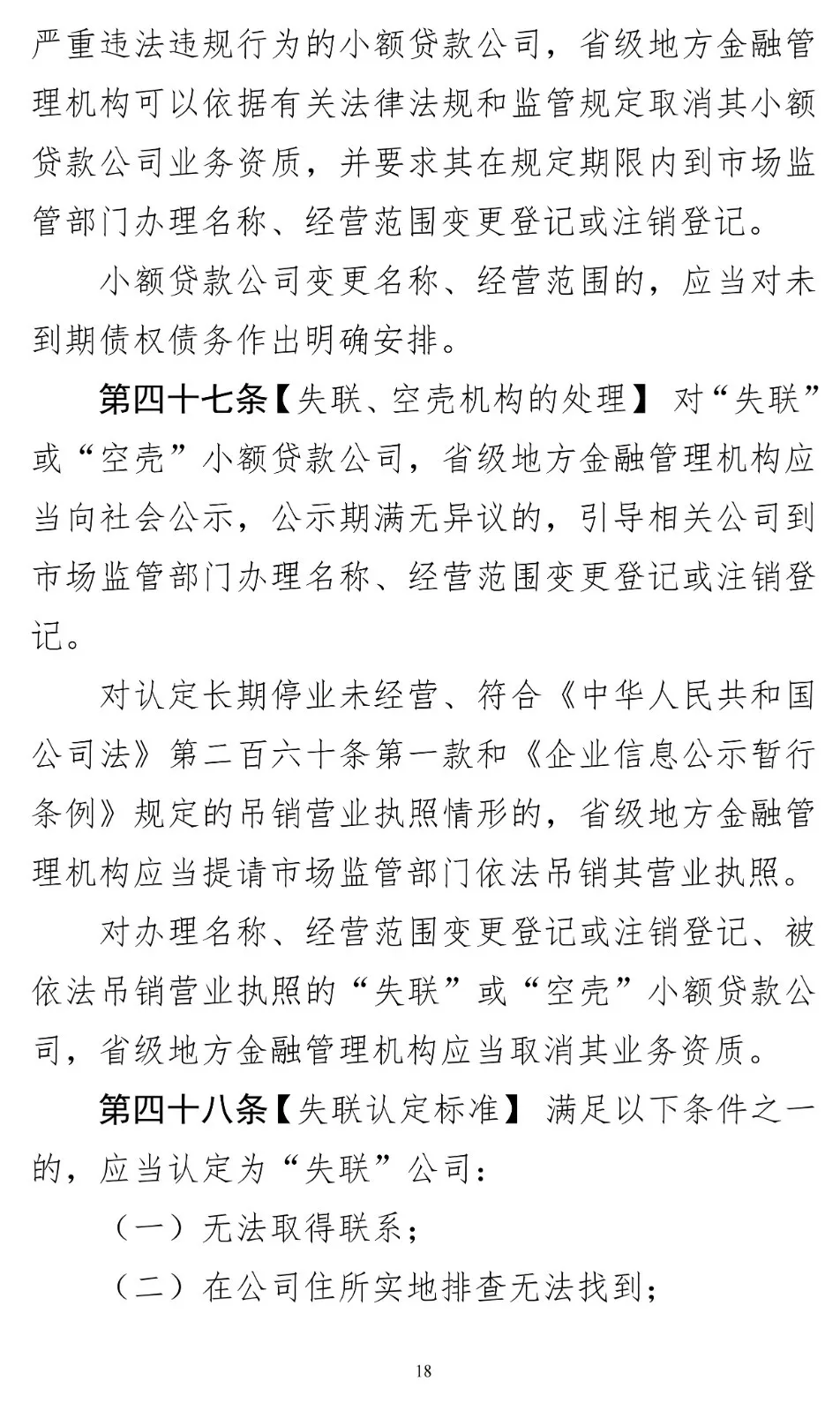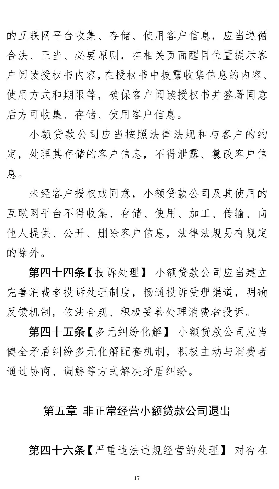 为规范小额贷款公司行为,加强监督管理,促进小额贷款公司稳健经营、健康发展,国家金融监督管理总局研究制定了《小额贷款公司监督管理暂行办法(征求意见稿)》(以下简称《暂行办法》),日前正式向社会公开征求意见。《暂行办法》共七章、六十六条,分别为总则、业务经营、公司治理与风险管理、消费者权益保护、非正常经营企业退出、监督管理、附则。