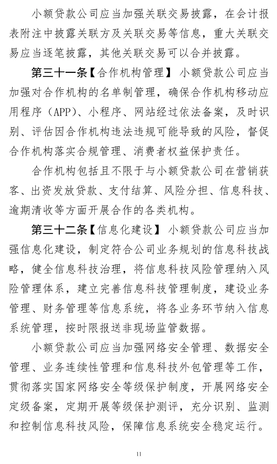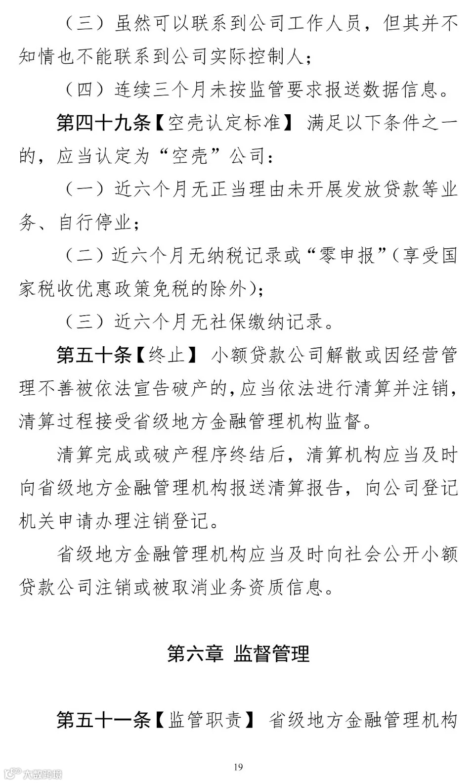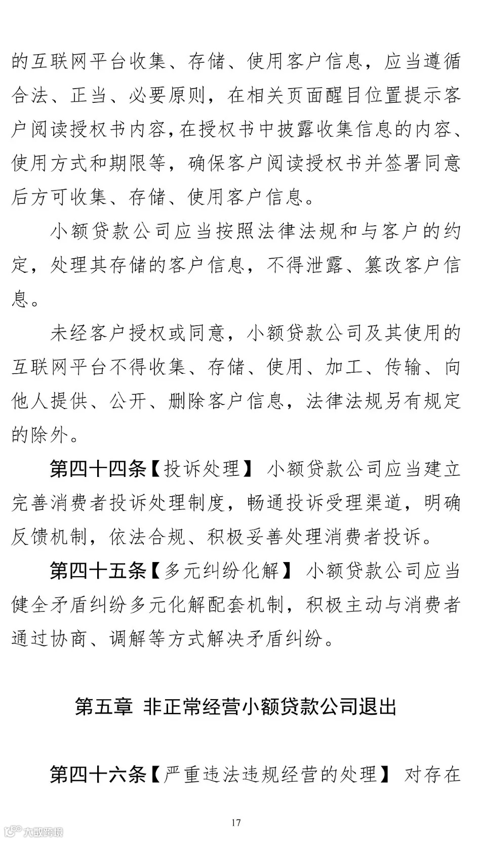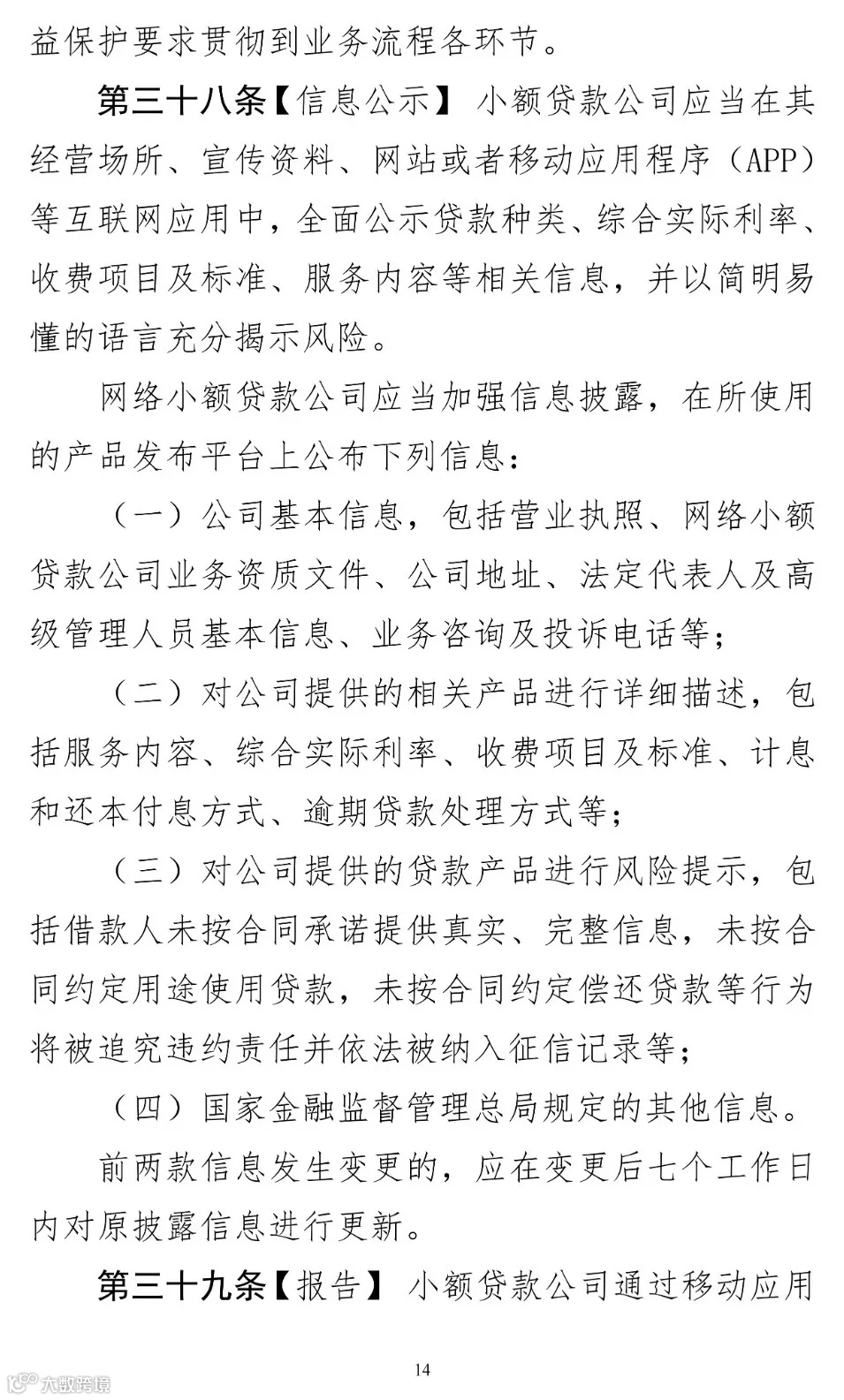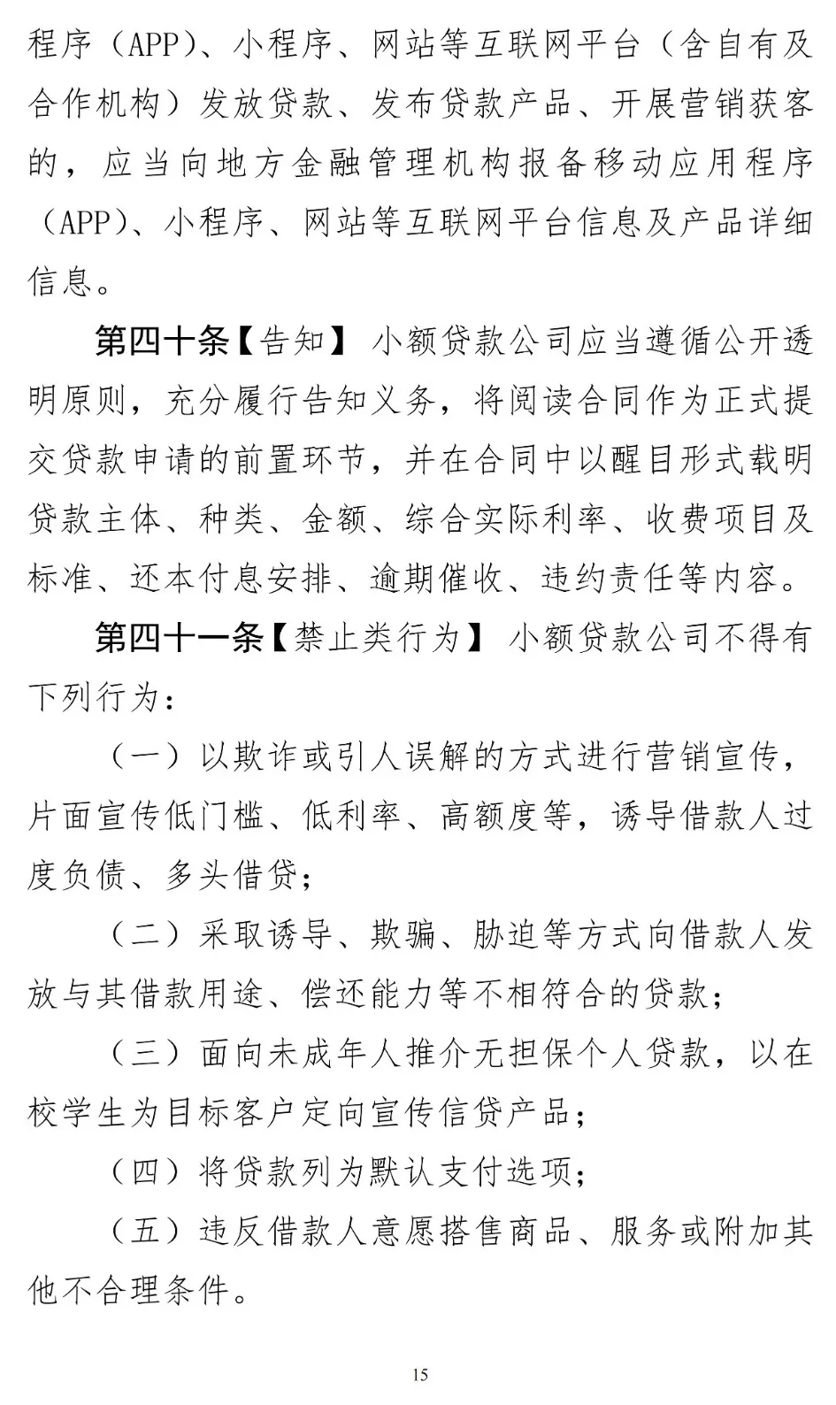 为规范小额贷款公司行为,加强监督管理,促进小额贷款公司稳健经营、健康发展,国家金融监督管理总局研究制定了《小额贷款公司监督管理暂行办法(征求意见稿)》(以下简称《暂行办法》),日前正式向社会公开征求意见。《暂行办法》共七章、六十六条,分别为总则、业务经营、公司治理与风险管理、消费者权益保护、非正常经营企业退出、监督管理、附则。