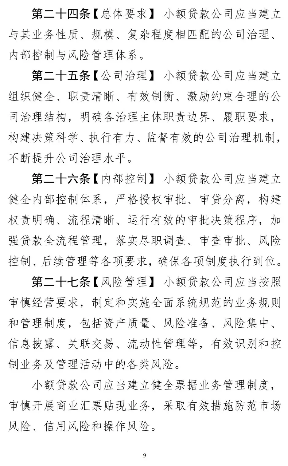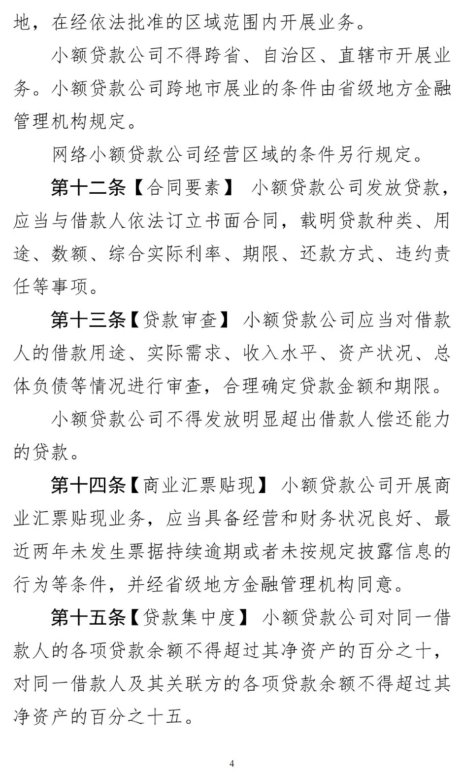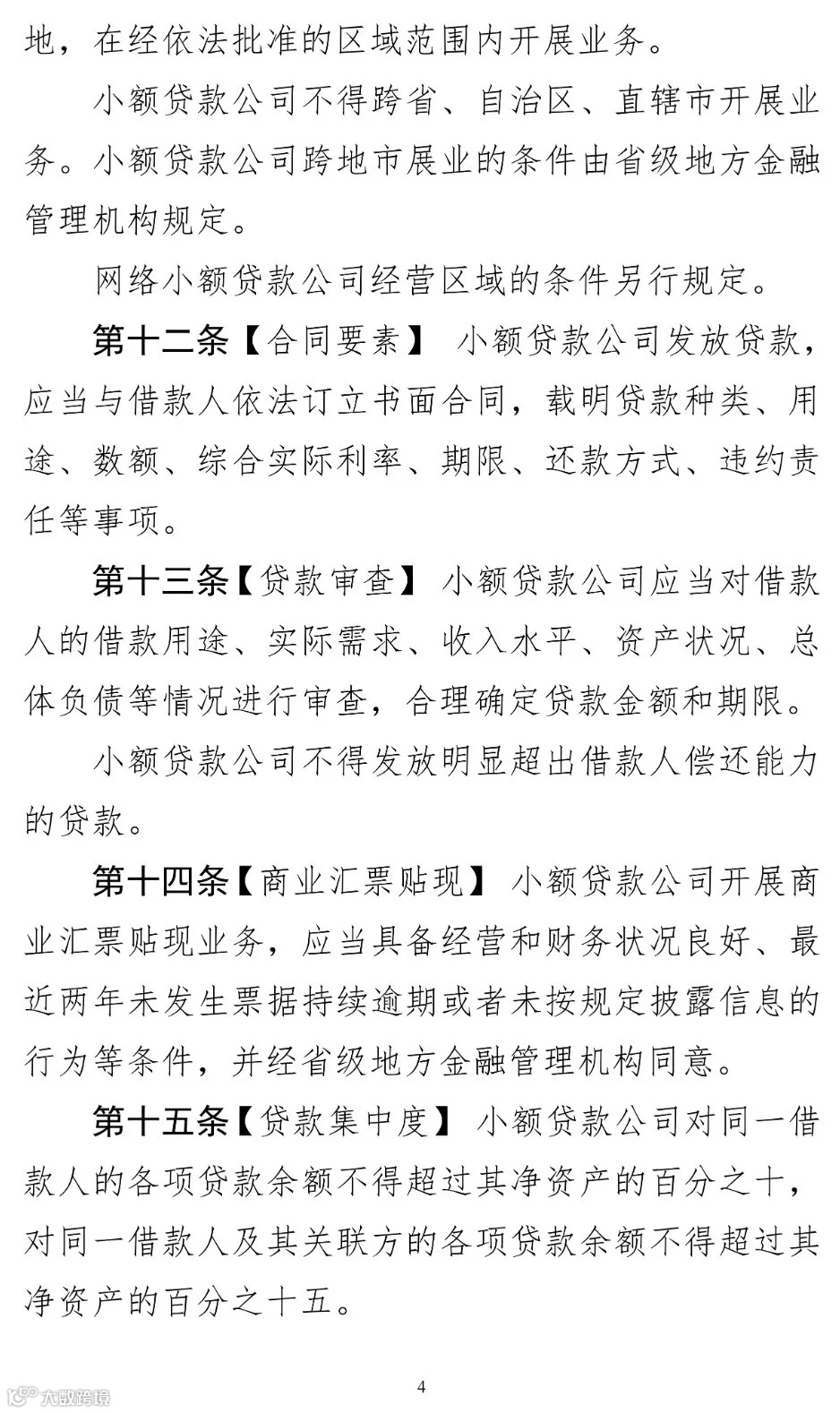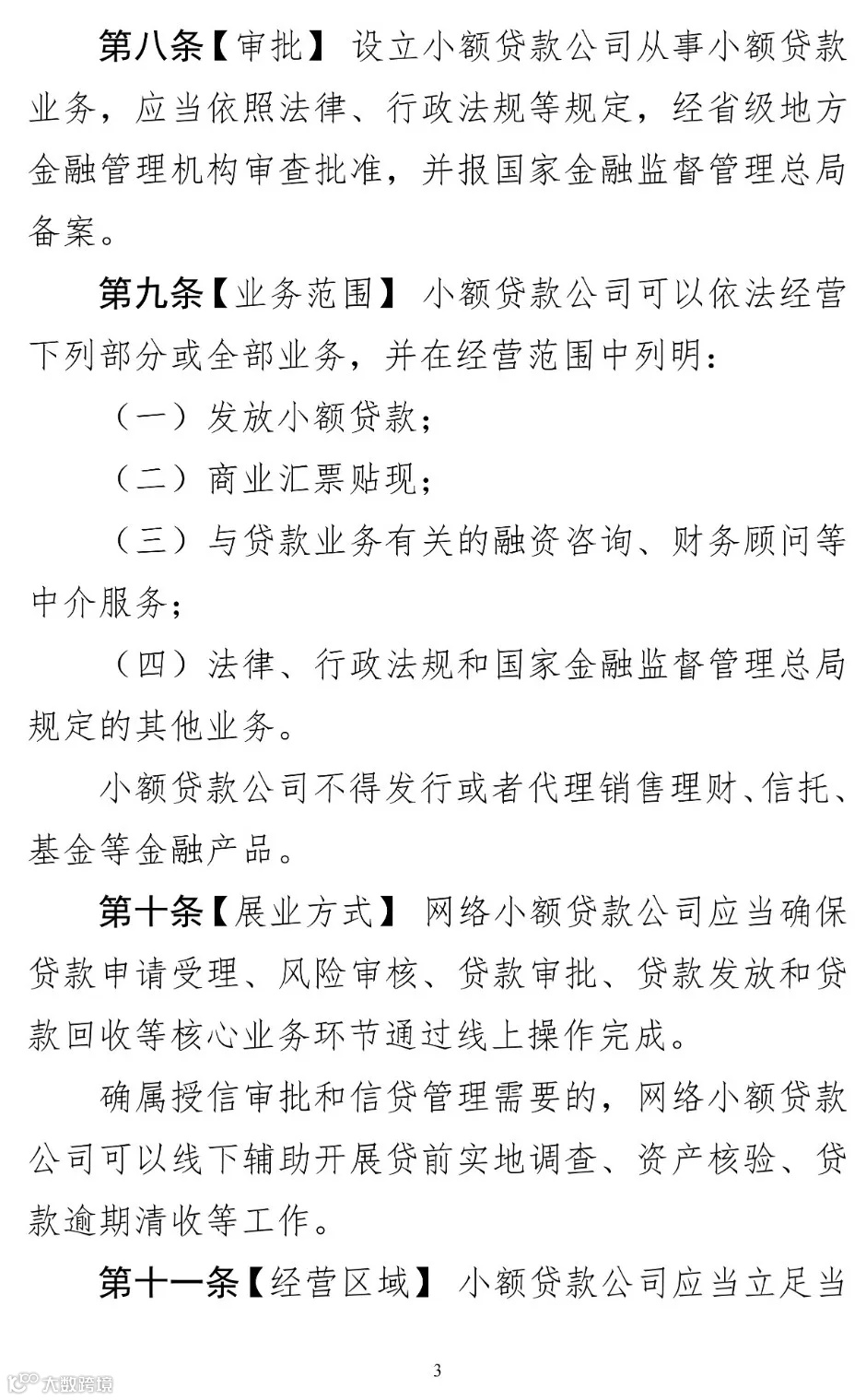 其中,《暂行办法》第九条【业务范围】上指出, 小额贷款公司可以依法经营下列部分或全部业务,并在经营范围中列明:(一)发放小额贷款;(二)商业汇票贴现;(三)与贷款业务有关的融资咨询、财务顾问等中介服务;(四)法律、行政法规和国家金融监督管理总局规定的其他业务。