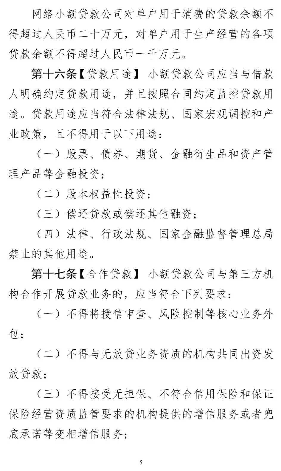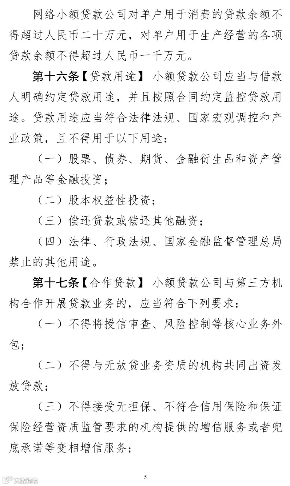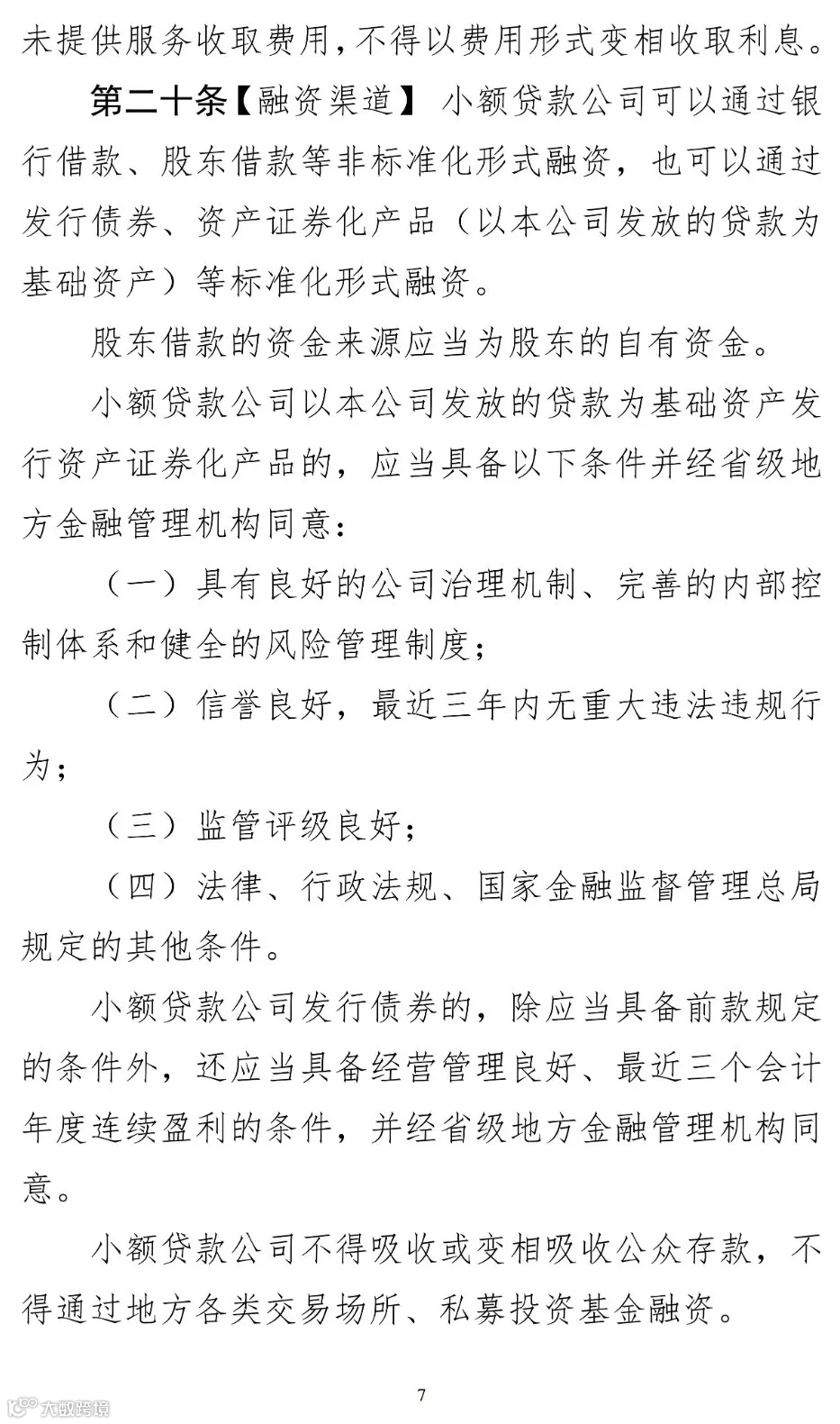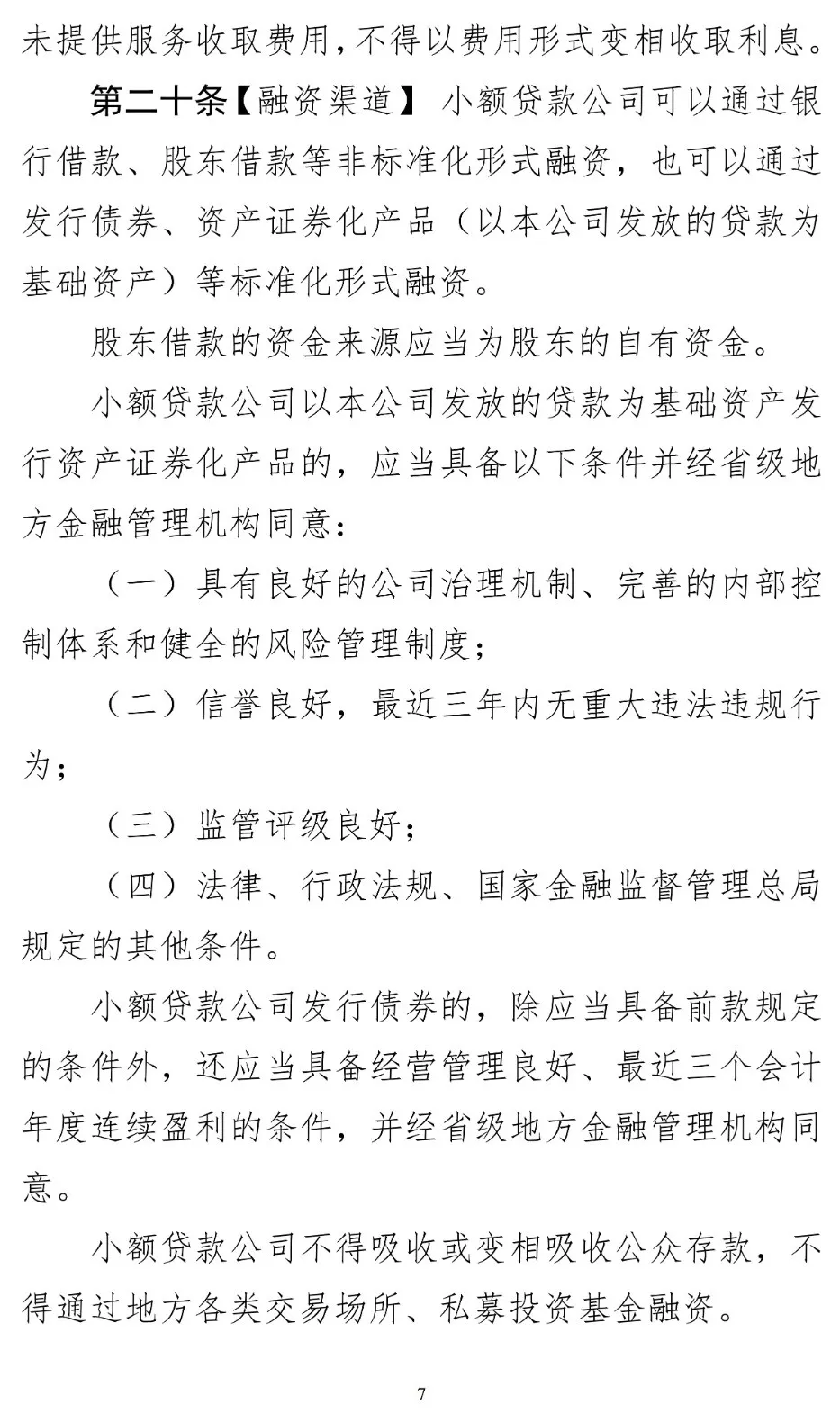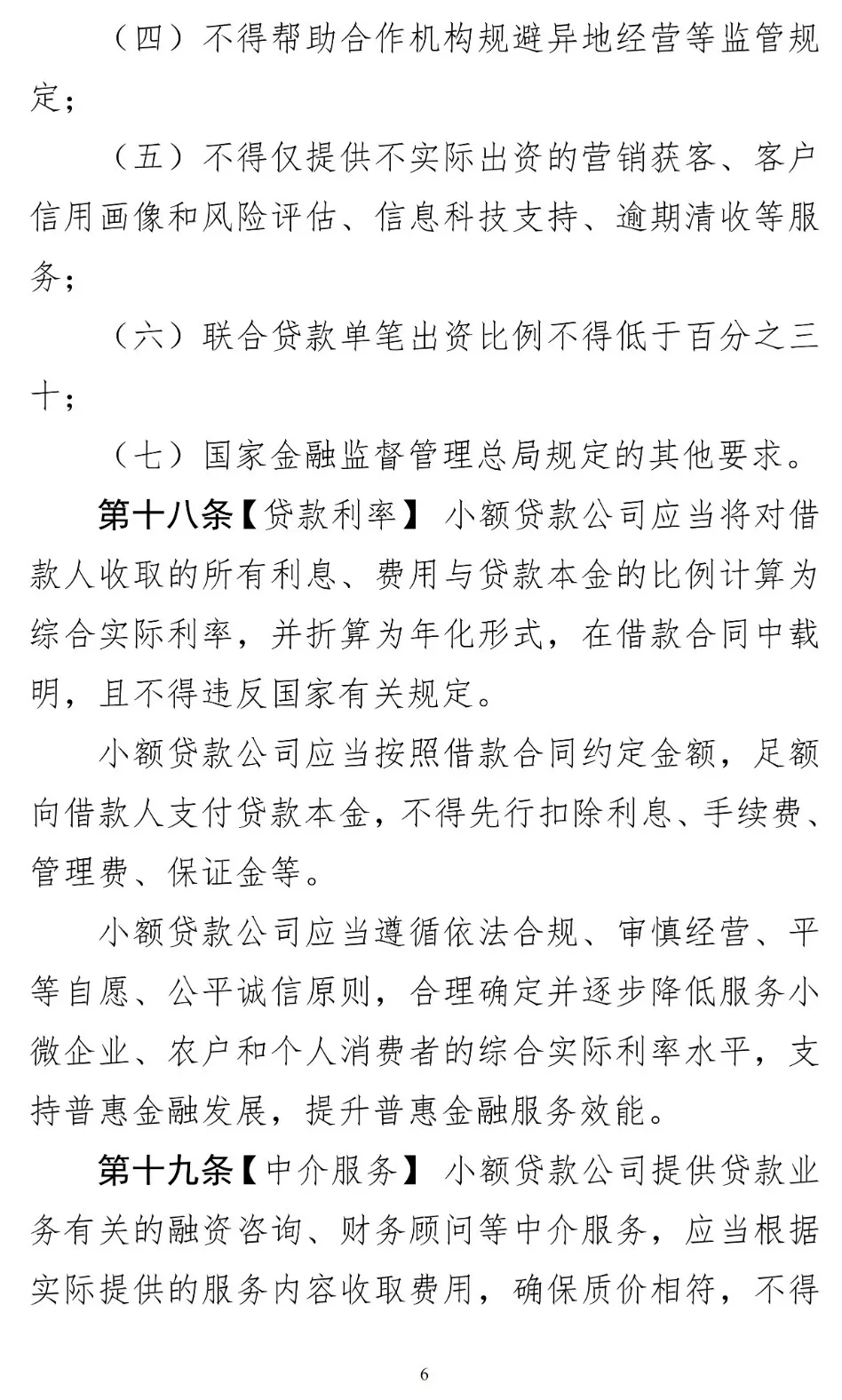 其中,《暂行办法》第九条【业务范围】上指出, 小额贷款公司可以依法经营下列部分或全部业务,并在经营范围中列明:(一)发放小额贷款;(二)商业汇票贴现;(三)与贷款业务有关的融资咨询、财务顾问等中介服务;(四)法律、行政法规和国家金融监督管理总局规定的其他业务。