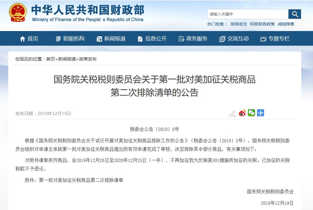 根据《国务院关税税则委员会关于试行开展对美加征关税商品排除工作的公告》(税委会公告〔2019〕2号),经国务院批准,国务院关税税则委员会公布第一批对美加征关税商品第二次排除清单,对第一批对美加征关税商品,第二次排除部分商品,自2019年12月26日至2020年12月25日,不再加征我为反制美301措施所加征的关税,已加征关税不予退还。第一批对美加征关税的其余商品,暂不予排除。
