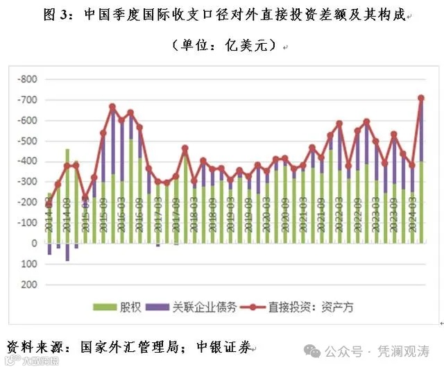 进一步分析,2024年二季度,中国对外直接投资净流出增加主要是因为对外股权投资和对外关联企业债务往来净流出增多。其中,对外股权投资净流出400亿美元,环比增加147亿美元,贡献了44.6%;对外关联企业债务往来净流出308亿美元,环比增加182亿美元,贡献了55.4%(见图3)。