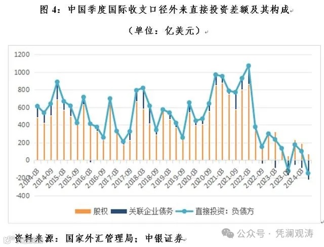 2024年二季度,中国外来直接投资时隔半年再度转为净流出,为史上第二次(上次为2023年三季度)。这主要是因为外来股权投资净流入减少,外来关联企业债务往来净流出增加。其中,外来股权投资净流入73亿美元,仅略高于2023年三季度的51亿美元,环比减少116亿美元,贡献了外来直接投资净流入降幅的46.5%;外来关联企业债务往来净流出220亿美元,创历史新高,环比增加133亿美元,贡献了54.5%(见图4)。同时,这也表明所有资本流动冲击都是从流入开始的,这是扩大对外开放必须承担的潜在风险。