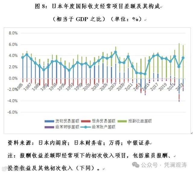一是受企业大举海外投资、国内产业空心化的影响,日本货物贸易顺差变得不太稳定,2010年以来有一半年份出现逆差,经常项目顺差主要来自海外投资收益。如2023年,日本货物贸易、服务贸易和经常转移三个项目均为逆差,靠投资收益顺差扭转乾坤,才让当年经常项目总体盈余,相当于名义GDP的3.6%。而且,海外投资不会造就投资收益立即大顺差。1996年之前,日本投资收益顺差与名义GDP之比在1%以下,1996~2004年在1%~2%,2005~2012年升至2%~3%,2013~2020年再升至3%~4%,2021年起进一步升至4%以上(见图8)。
