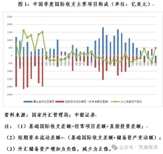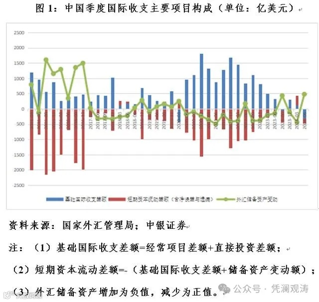由于2024年二季度国际收支为初步数据,故没有关于证券投资、金融衍生品交易和其他投资等项目的细项数据。但由国际收支平衡表的等式(基础国际收支差额+短期资本流动差额+储备资产变动额=0)可以推出,当季短期资本流动(含净误差与遗漏额)由上季净流入319亿转为净流出172亿美元,净流入环比减少491亿美元(见图1)。