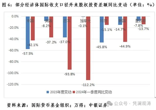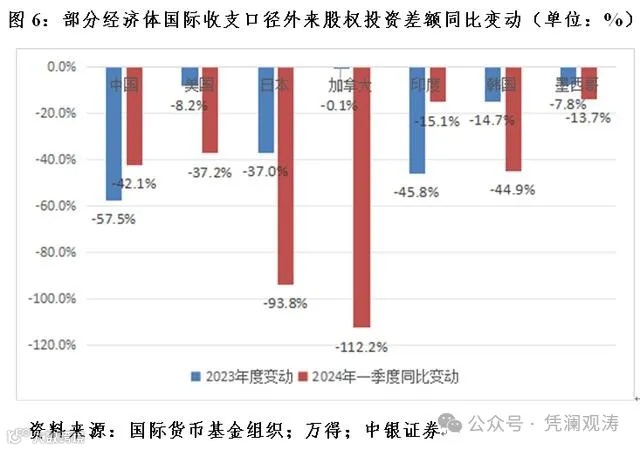 外来股权投资净流入减少并非中国特例。从可比的国际收支口径看,2024年一季度,中国外来股权投资净流入同比下降42.1%,美国、日本、加拿大、印度、韩国、墨西哥分别下降37.2%、93.8%、112.2%、15.1%、44.9%和13.7%。而且,同为外来股权投资同比减少,中国的降幅较2023年全年有所收敛(二季度降幅又较一季度进一步收敛),美国、日本、韩国、墨西哥的降幅还在进一步扩大,加拿大更是因为外来股权投资由净流入转为净流出,降幅超过了100%(见图6)。