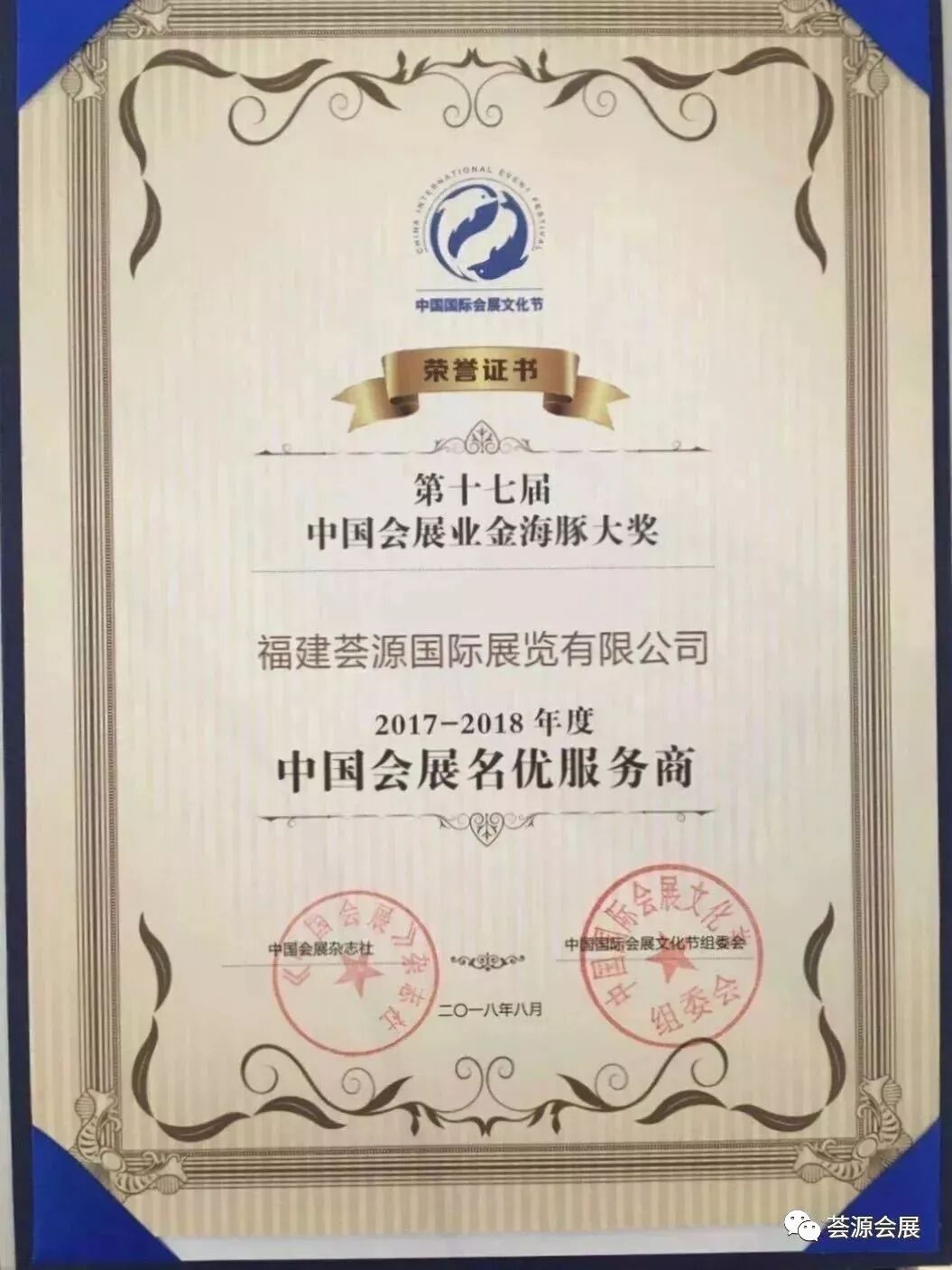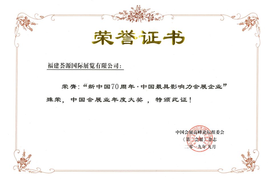 2018年贸促会评定我司出展规模全国居前六,是中国十佳展览公司,中国最具影响力会展企业,福建省文化十强企业,福建省著名商标,福建省守合同重信用企业,福州高新区纳税大户称号,谷歌中国战略合作商,福建省进出口商会会长,福州市会展行业协会会长,中国会展经济研究会理事单位,荣获2017-2018年度中国会展业金海豚大奖之中国会展名优服务商奖。