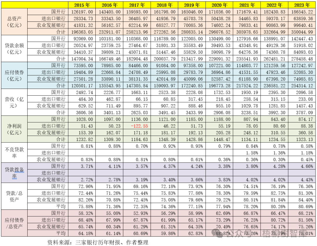截至2023年底,三家银行的总资产合计达到35万亿,位于中国银行与建设银行之间。其中,国开行、农发行与进出口银行的总资产分别为18.65万亿、9.96万亿和6.39万亿。显然,仅从体量来看,三家银行的重要性已经不言而喻,具有深远影响和系统重要性。