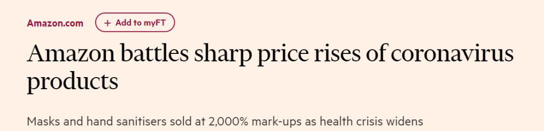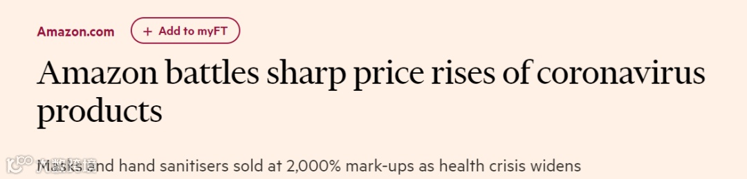 《金融时报》报道称,在亚马逊网站上,有些商家甚至将免洗洗手液和口罩的价格提升至日常零售价的2000%。