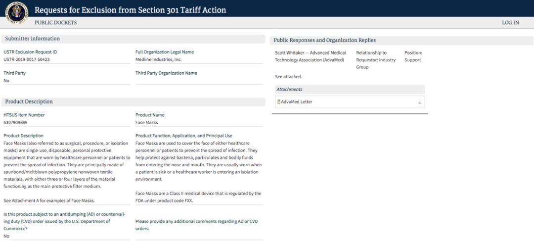 Medline Industries向美国贸易代表办公室提交的口罩样本图