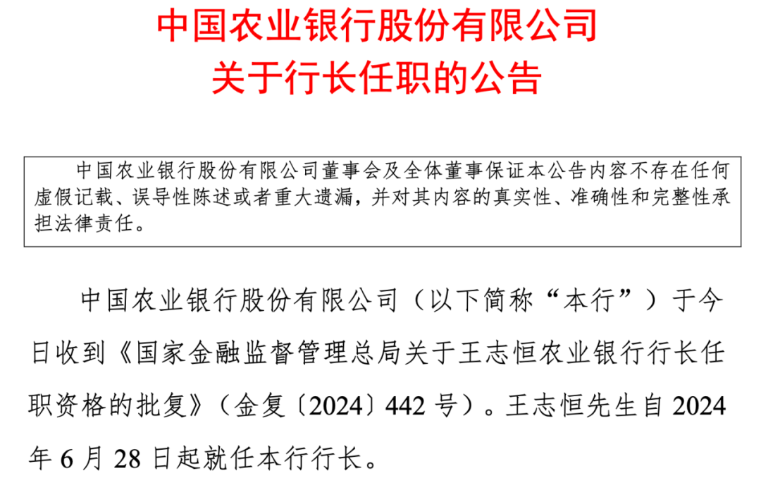 6月28日晚间,中国农业银行发布公告称,该行于当日收到《国家金融监督管理总局关于王志恒农业银行行长任职资格的批复》,王志恒自2024年6月28日起就任农业银行行长。