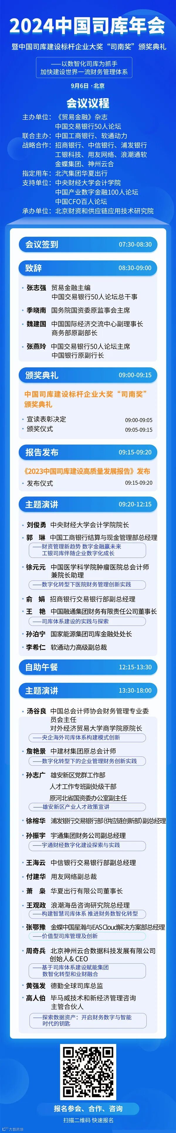 综上所述,司库在央国企加强供应链金融服务管理方面发挥着不可替代的作用。今年9月6日,2024中国司库年会暨中国司库建设标杆企业大奖“司南奖”颁奖典礼上,我们将发布《中国司库建设高质量发展报告(2023)》,并邀请业内专家、央国企代表、科技厂商代表、银行机构代表、咨询等专业机构代表等人士等齐聚一堂,为您详细解读央国企如何通过司库加强供应链金融服务管理。扫描下方二维码,与他们面对面,吸收行业前沿知识,学习宝贵实践经验!