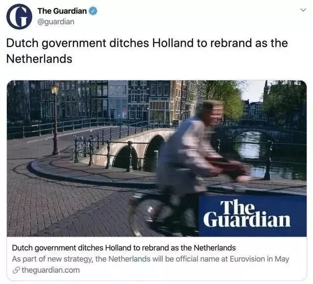 据英国《卫报》(The Guardian)报道,荷兰政府正式宣布:今后将不再使用“Holland”(荷兰)的叫法,一律使用官方的正式名称“the Netherlands”(尼德兰)。据《悉尼先驱晨报》援引EFE通讯社的消息称,这一品牌的重新命名预计将花费近32万美元,还包括一个将缩写NL与荷兰国花橙色郁金香相结合的标志。