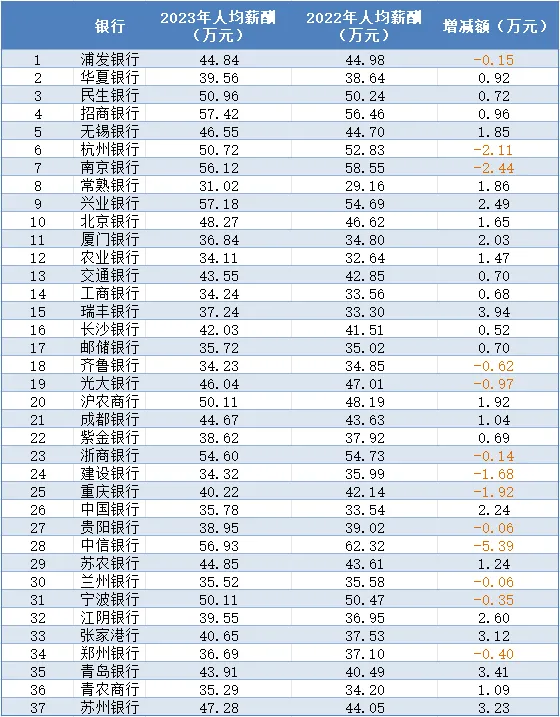 据不完全统计,37家公布人均薪酬的A股上市银行中,有13家2023年人均薪酬均出现了不同幅度的下降。