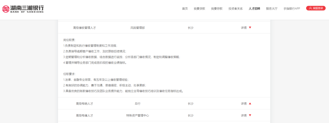 最先引发关注的是三湘银行的招聘公告。该行公告显示,面向全国招聘“高级催收管理人才”和“高级电催人才”,要求应聘人员具有大学本科及以上学历,有五年及以上催收相关经验。