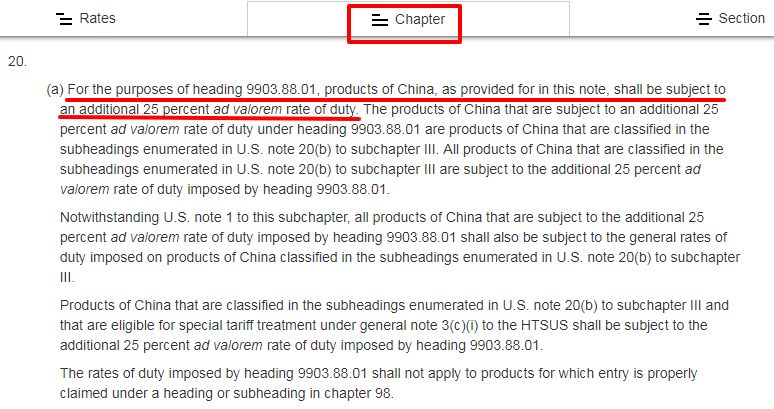 这句话中提及“note 20”是个什么东西呢?在“Chapter”页面下我找到了这个note 20,它是对中国产品加税的一个解释。这里明确说明了,25%是额外征收的税率。下文中也继续列出了归在“9903.88.01”项下的编码。