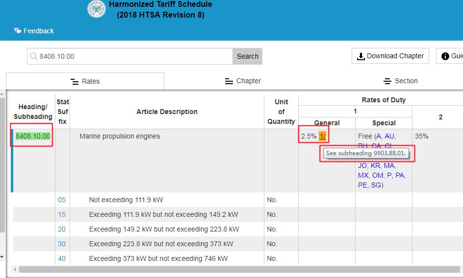 我们以在美国加征范围的税号“8408.10.00船用推进发动机”为例演示,这项产品被列入了第一批340亿美元的加税清单中,此前它的进口税率在“General”处显示是2.5%。但它后面现在跟着一个“1”,显示让我们再去查看“9903.88.01”这个副标题。
