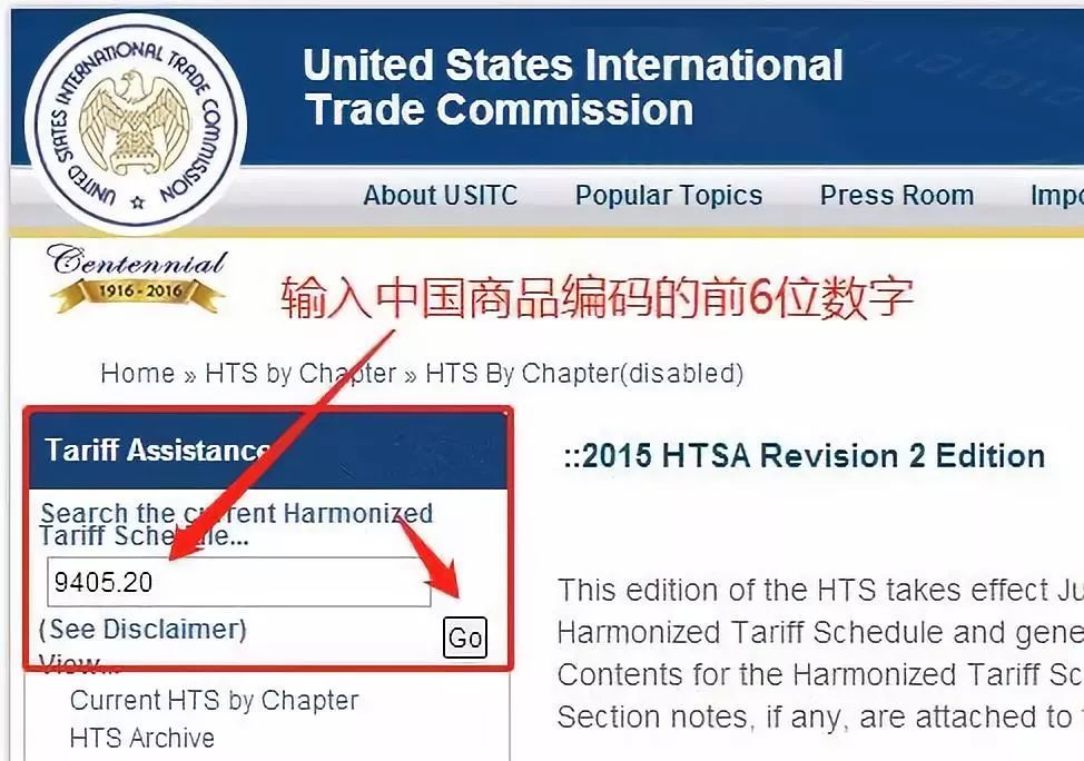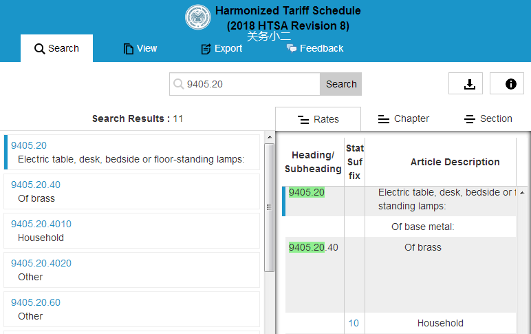 1. 查询HTS CODE:进入上述网站,在Tariff Assistance项下Search the current Harmonized Tariff Schedule...下的搜索框中输入输入中国HS CODE的前六位数,如台灯940520****,搜索结果页面的左边框有详细的HTS CODE,根据自己的产品选择HTS CODE。