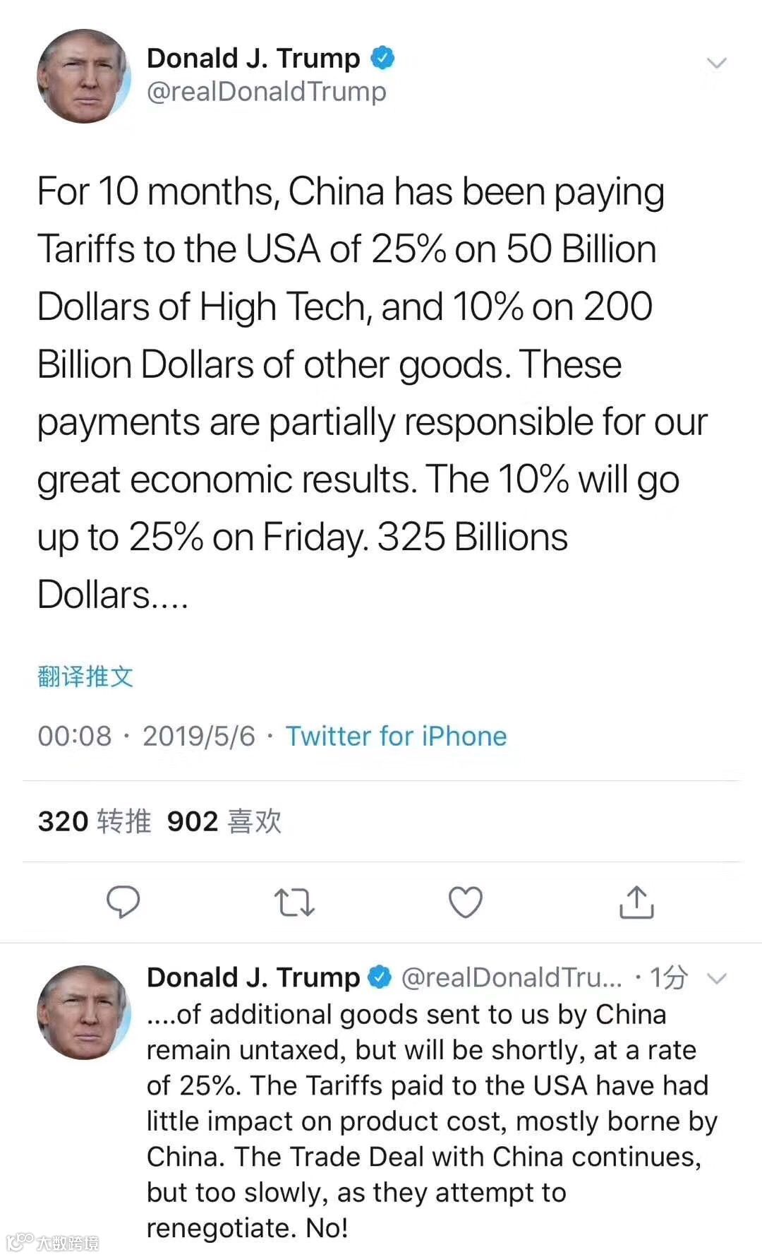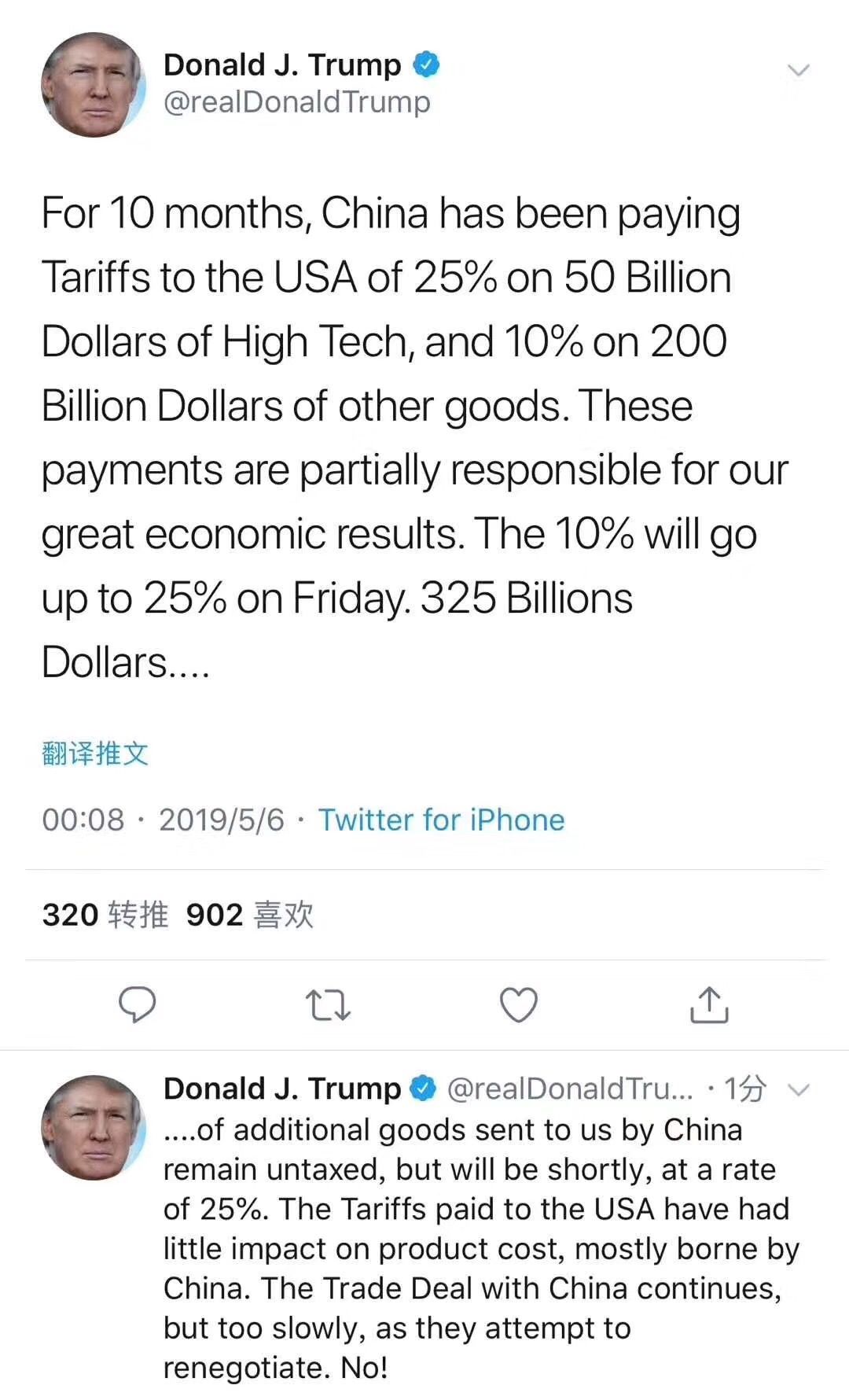 特朗普当地时间5月5日发推特称,在过去征税的基础上,决定继续加征2000亿美金进口商品的关税,在本周五(5月10日)就从10%加到25%,之后还考虑对额外的3250亿美金商品加税。