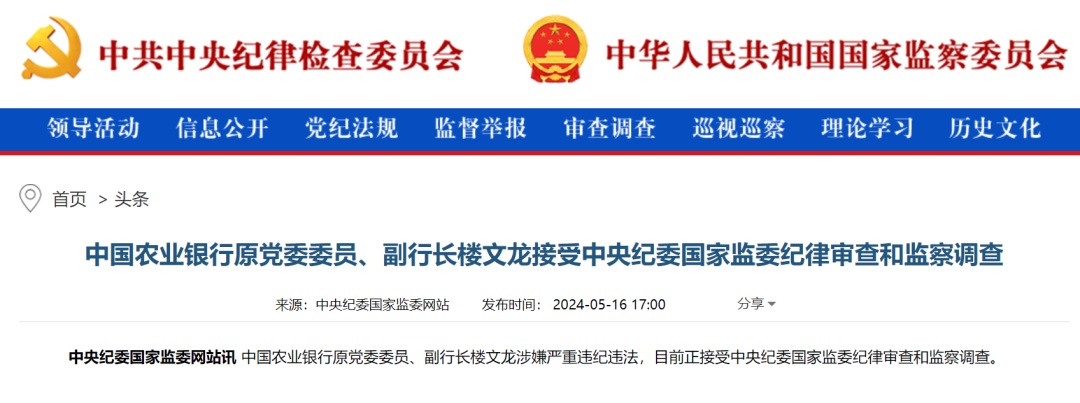 据中央纪委国家监委网站5月16日消息,中国农业银行原党委委员、副行长楼文龙涉嫌严重违纪违法,目前正接受中央纪委国家监委纪律审查和监察调查。