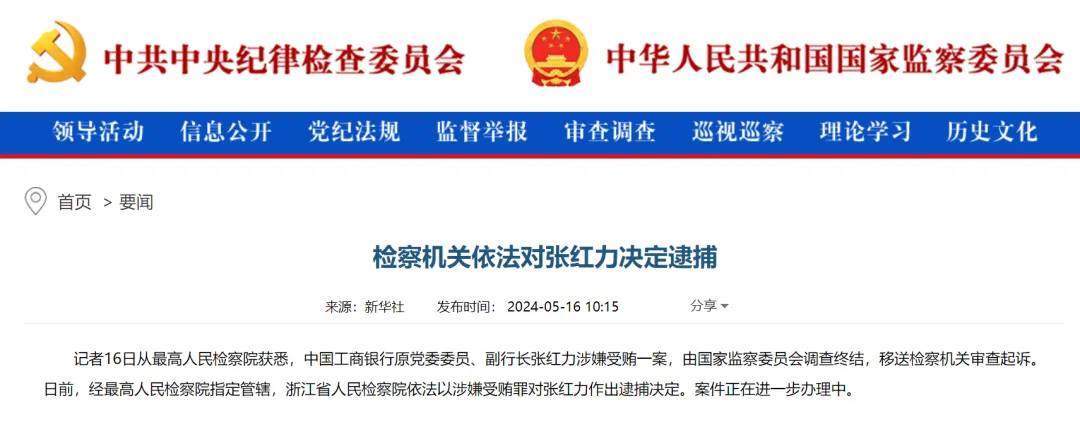 同日,据最高人民检察院消息,中国工商银行原党委委员、副行长张红力涉嫌受贿一案,由国家监察委员会调查终结,移送检察机关审查起诉。日前,经最高人民检察院指定管辖,浙江省人民检察院依法以涉嫌受贿罪对张红力作出逮捕决定。案件正在进一步办理中。