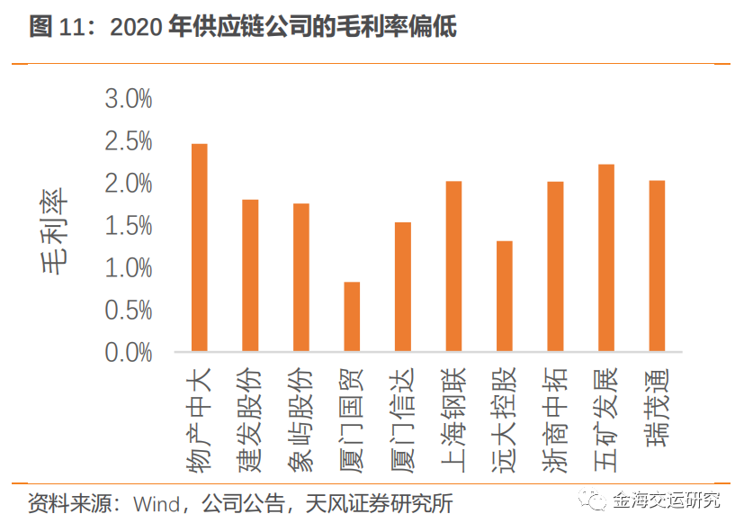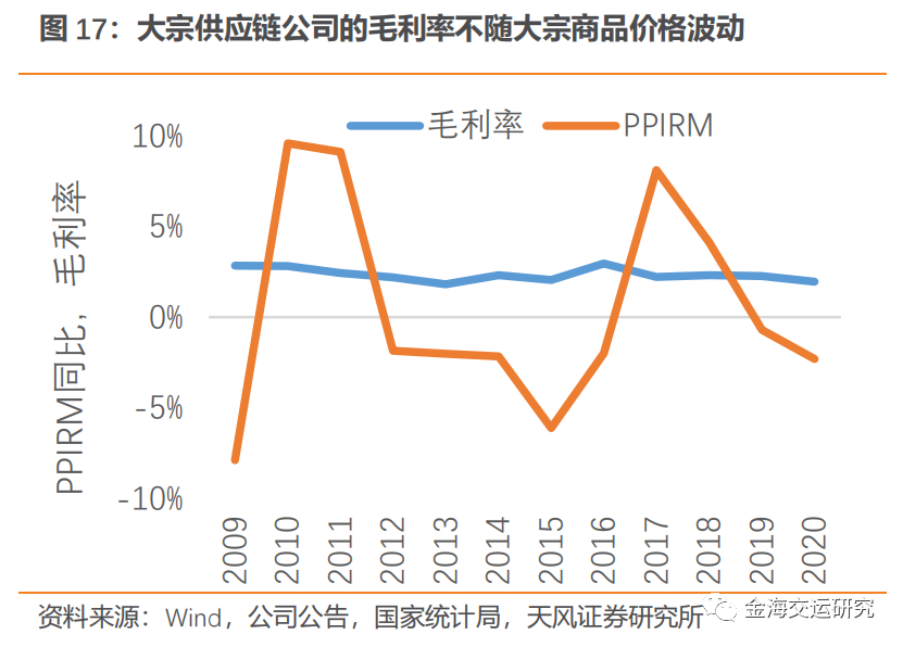 供应链公司的价格杠杆低。2009-20年大宗商品价格大幅波动,PPIRM也呈现明显的波动。但是大宗供应链公司的毛利率始终在2%上下窄幅波动,与PPIRM波动无关,说明供应链公司的价格杠杆低。