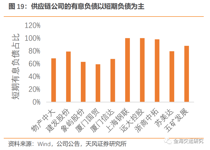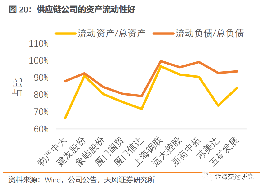 供应链公司的资产流动性好,与高负债率匹配。供应链公司负债率高,且以短期负债为主,看似偿债压力大。但是供应链公司的资产流动性也很好,且流动资产超过流动负债,所以风险并不大。