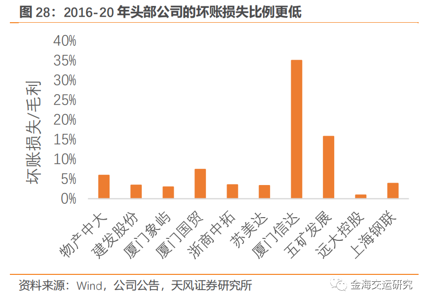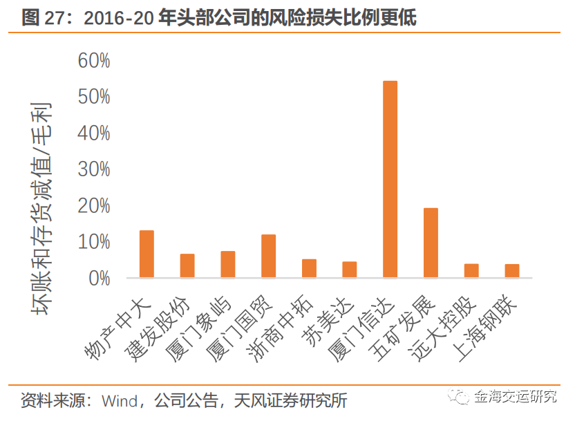 头部供应链公司久经考验、风控严密,风险较小。物产中大、建发股份、厦门象屿、厦门国贸、浙商中拓等头部公司,经历了2008年次贷危机、2013年信用收紧、2015年经济低谷和大宗商品价格下跌、2018年中美贸易冲突、2020年新冠疫情的冲击,已经建立了较为严密的风控体系,有能力应对未来的外部冲击。从经营结果看,头部供应链公司的风险损失比例更低。