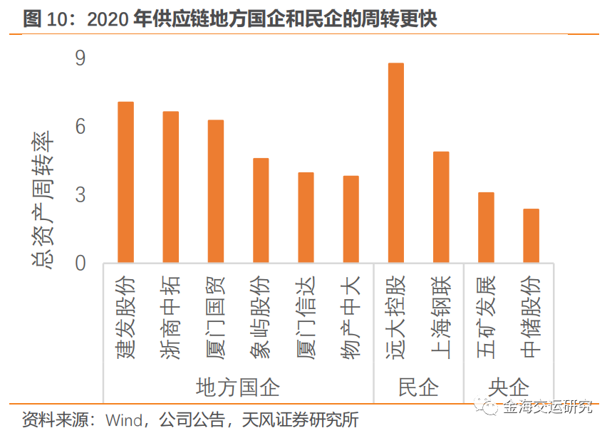 低利润率决定市场化企业才能盈利。大宗供应链公司的毛利率在2%左右,净利率在0.5%左右,较低的利润率决定了只有高效经营才能持续盈利。地方国企和民企的资产周转率高于央企,效率更高。现存的供应链公司,都是在一轮轮市场竞争中胜出并留存下来的。