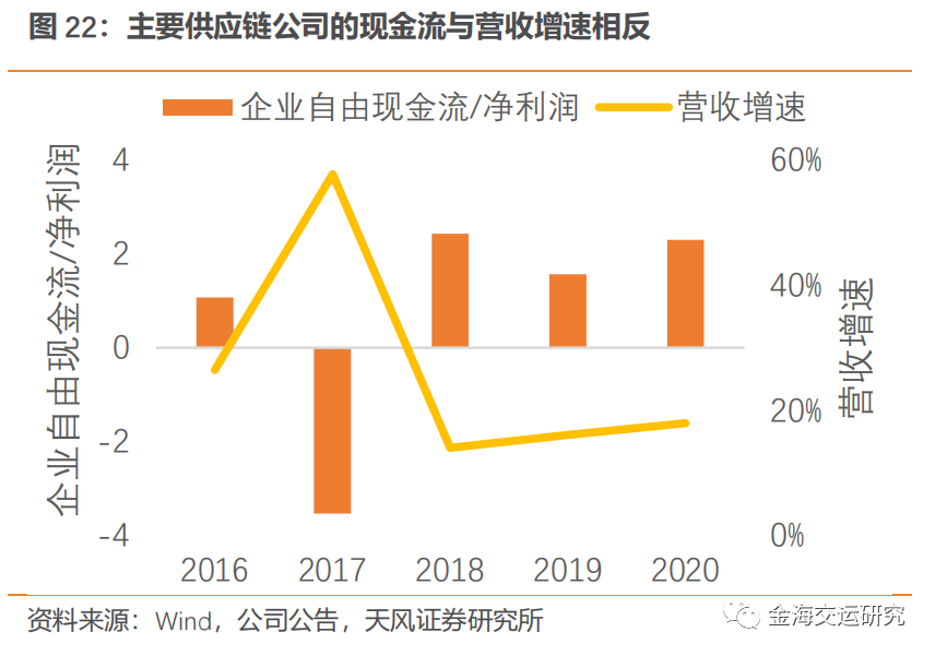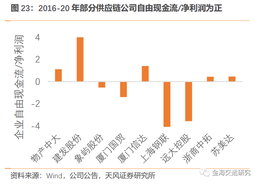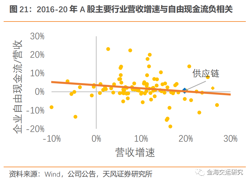 公司成长性和现金流负相关。业务增长带来资本开支需求,当增速超过利润留存带来的资本金增速,往往需要外部融资,表现为自由现金流出。A股各行业(剔除金融地产)的自由现金流与营收增速负相关。2016-20年供应链行业高增长,自由现金小幅流入,好于多数行业。