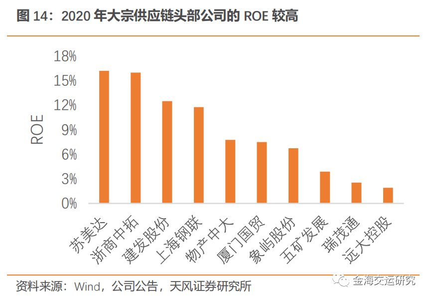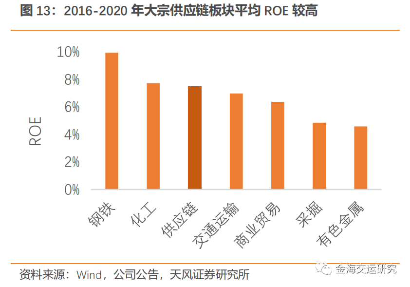 大宗供应链的盈利能力较强。综合考虑利润率和周转率的ROE,能更好衡量供应链行业的盈利能力。与申万相关行业比较,供应链行业的ROE水平并不低。2020年头部供应链公司的ROE在10%左右,部分优秀的公司接近20%。