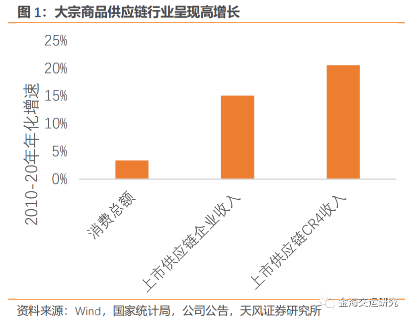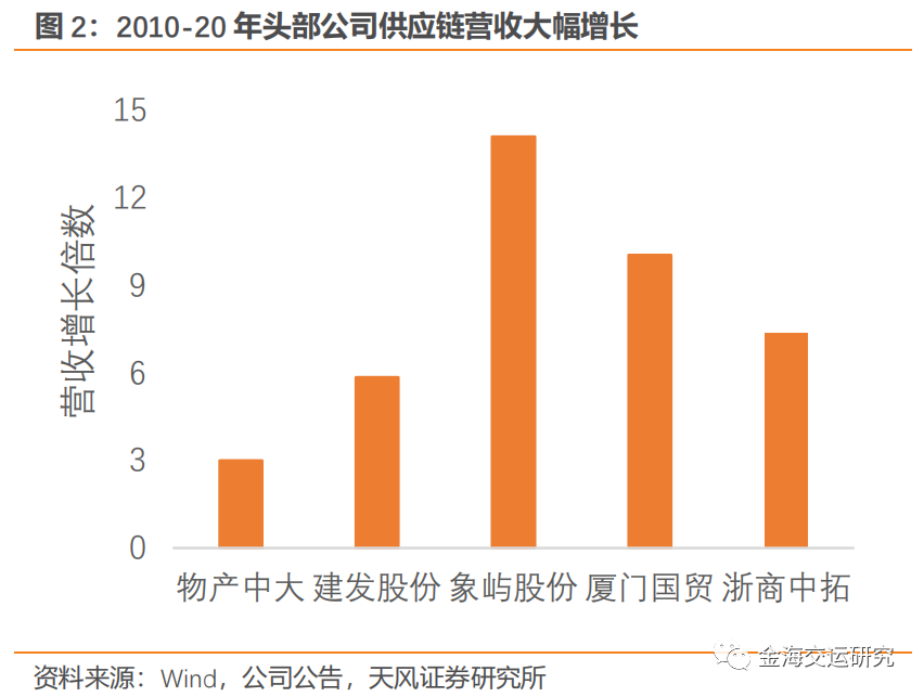 大宗商品消费低增长,头部供应链公司高增长。2010-20年,中国大宗商品消费呈现低增长,但是大宗商品供应链行业(上市公司)收入呈现高增长。头部公司的增速更高,十年间收入增长3-14倍。