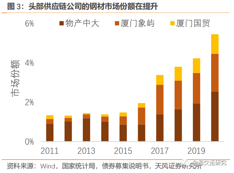 头部供应链公司增长来自于市场份额提升。头部供应链公司的核心业务品类都包含钢材。2015-20年,三家头部公司的钢材业务市场份额大幅提升。在头部公司高增长的同时,部分中小型公司的业务规模在萎缩,甚至陆续退出市场,行业健康发展。