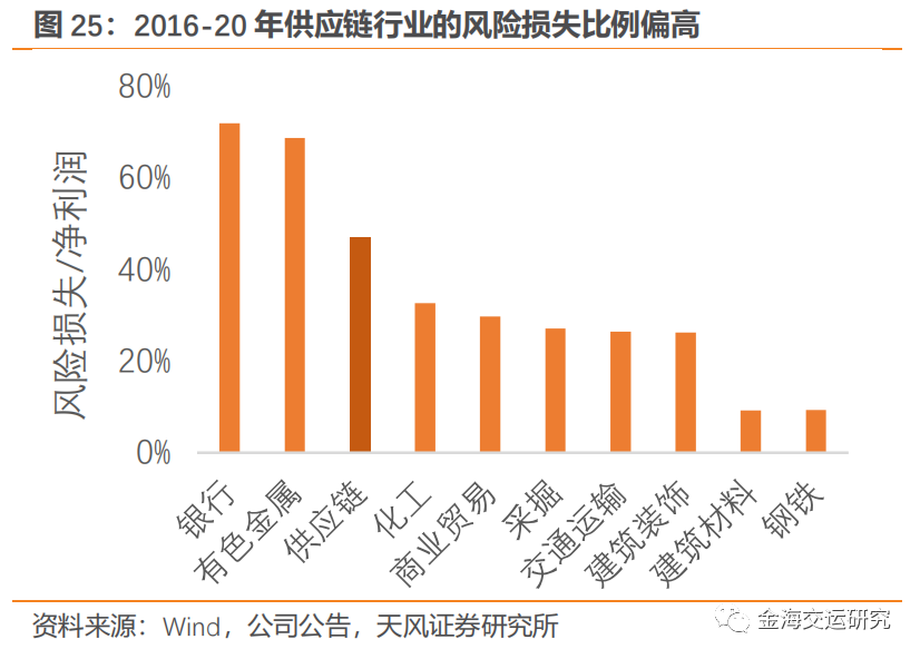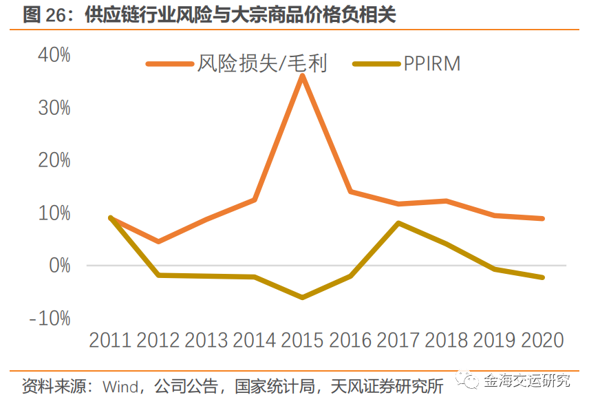 供应链行业风险与大宗商品价格负相关。在经济下行、大宗商品价格下跌、信用紧缩阶段,存货减值风险、坏账风险都较高;而在经济上行、大宗商品价格上涨、信用宽松阶段,风险较小。预计2021-22年全球经济景气、大宗商品价格处于高位,风险较小。
