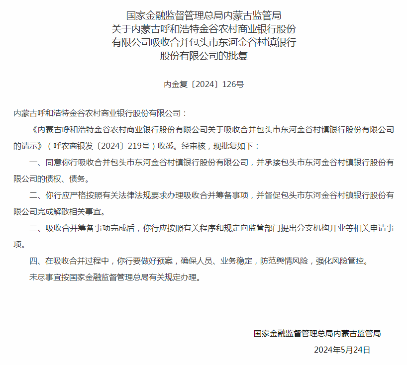 据了解,此前于5月24日,经内蒙古监管局批复,内蒙古呼和浩特金谷农商银行获准吸收合并包头市东河金谷村镇银行,并承接该行的债权、债务。