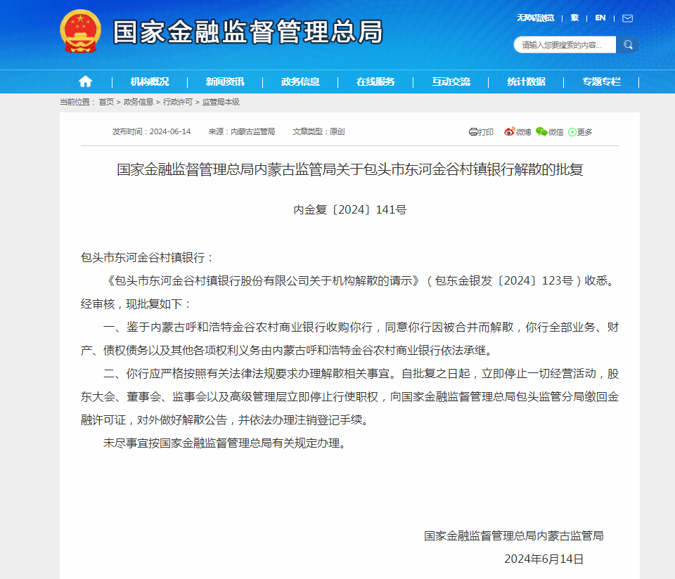 批复文件显示,国家金融监督管理总局内蒙古监管局已收到《包头市东河金谷村镇银行股份有限公司关于机构解散的请示》,经审核,鉴于内蒙古呼和浩特金谷农村商业银行收购包头市东河金谷村镇银行,同意该行因被合并而解散,该行全部业务、财产、债权债务以及其他各项权利义务由内蒙古呼和浩特金谷农村商业银行依法承继。