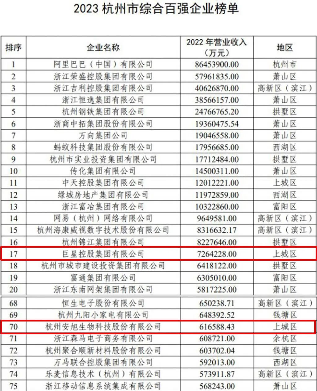 安旭生物以2022年度营收61.6688亿元,位列《2023杭州市综合百强企业》榜单第70位。