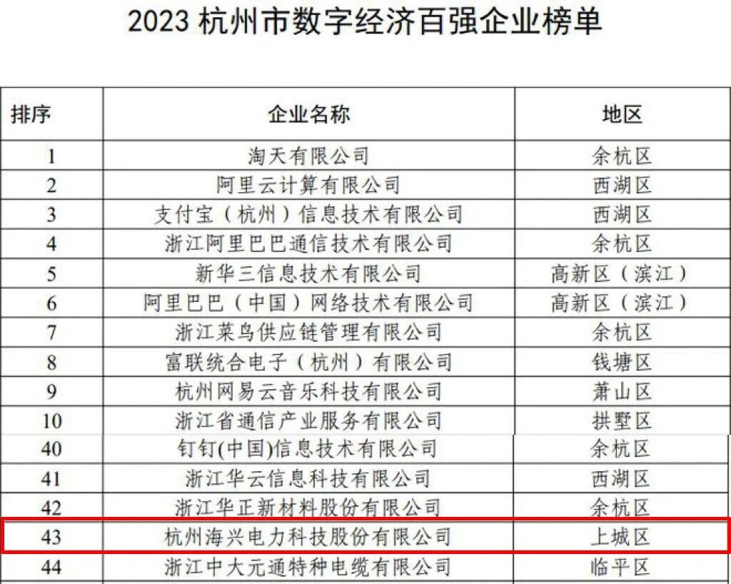 值得关注的是,这是杭州首次发布《2023杭州市综合百强企业》榜单,其中智慧城2家企业上榜;在《2023杭州市数字经济百强企业》榜单中,海兴电力为全区唯一上榜企业。