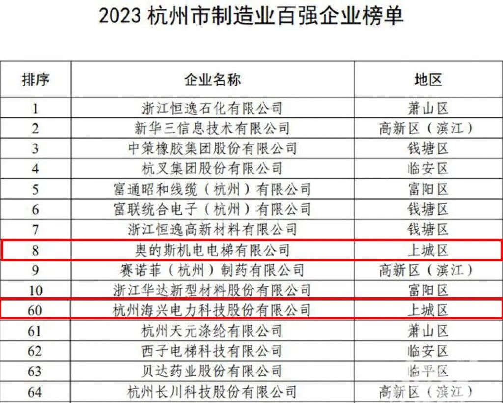 继入围《2021杭州市制造业(数字经济)百强企业》榜单后,奥的斯机电再度入围《2023杭州市制造业百强企业》榜单,位列榜单第8位。