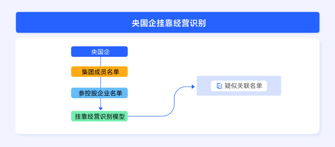 挂靠经营识别功能,从央国企出发,基于全量集团知识库对各央企集团成员名单进行提取,并输出各成员单位所属层级,挖掘集团成员对外参控股全量企业名单,通过股权穿透标识出是否为民营企业。