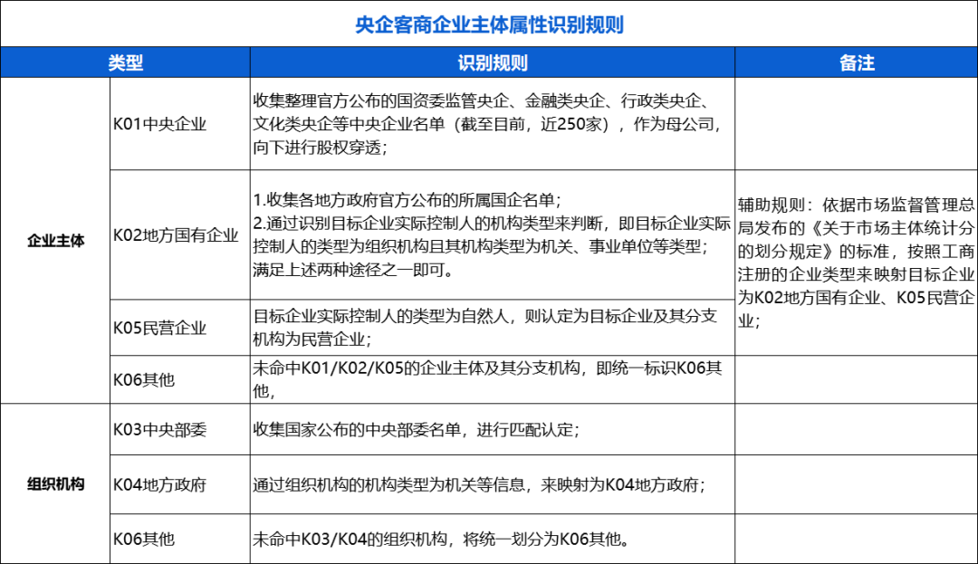 客商属性识别,基于政策要求,以国资委、财政部令第32号《企业国有资产交易监督管理办法》第四条关于“国有”企业认定标准、民营企业定义及组织机构类型,按照国资委司库系统关于客商企业主体性质报送要求,将客商主体性质划分为中央企业、地方国有企业、中央部委、地方政府、民营企业、其他,6个类型。
