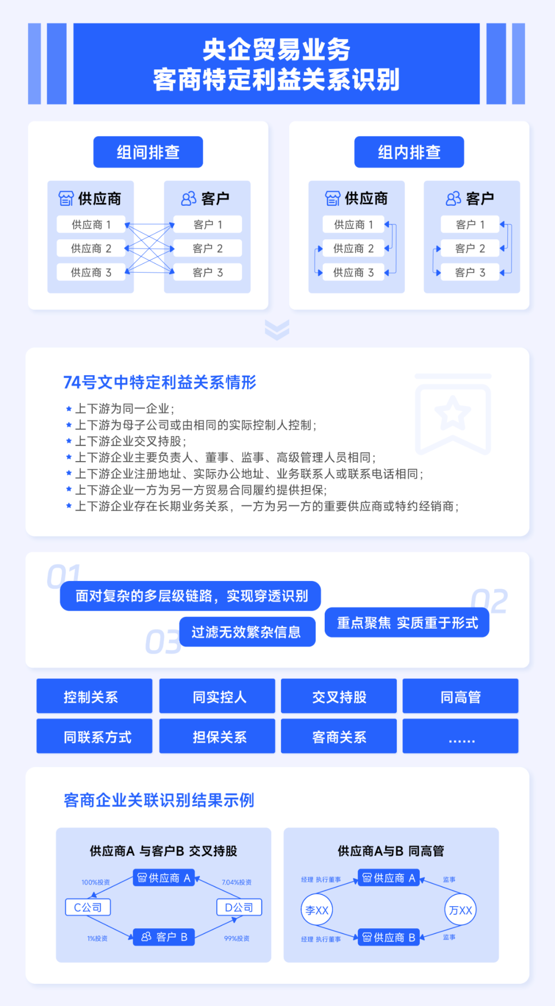 政策要求:2023年10月国资委74号文发布,明确虚假贸易“十不准”,其中【二、不准参与特定利益关系企业间开展的无商业目的的贸易业务】对存在特定利益关系的情形进行了说明,共分为8类。央企在开展业务前,可以通过对客户、供应商股权关系、投资关系、任职高管等信息进行调查,对关联方进行疑似线索筛查,进行异常贸易风险的事前防范及排查。