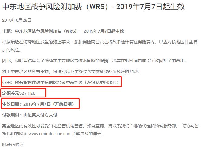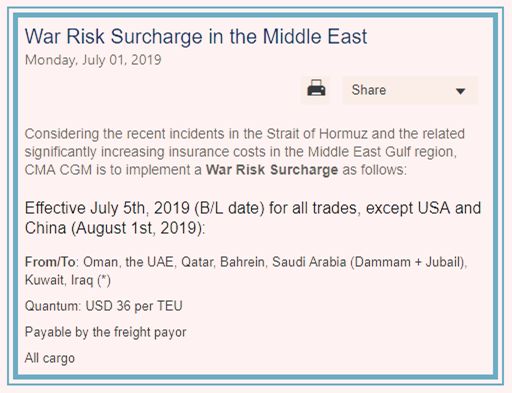 根据最近在海湾地区发生的海上事故,船舶保险商已决定将战争险计算在保险费内,以应对该地区日益增加的风险。因此,阿联酋航运为了继续在中东地区提供不间断的服務,必需在短时间内向货主收回相关的费用。