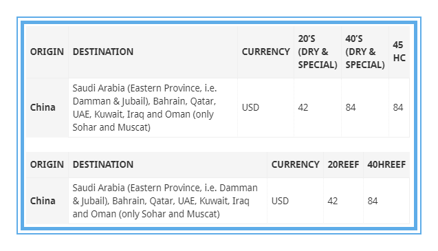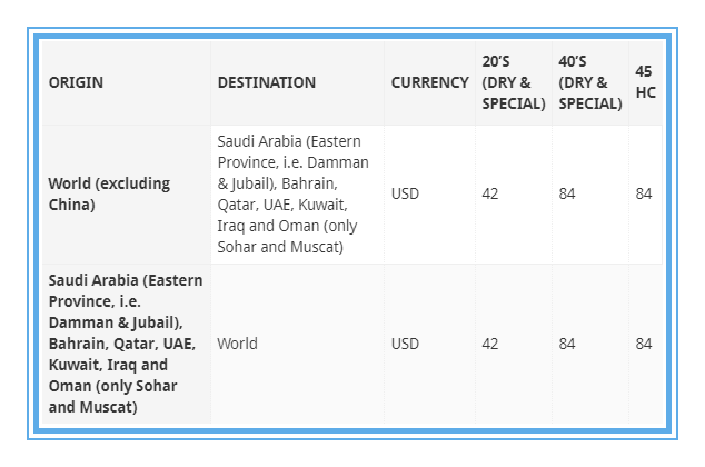 鉴于中东地区的紧张局势,地中海航运公司正在对所有进出阿拉伯海湾的货物征收战争风险附加费(巴林、伊拉克、科威特、阿曼、卡塔尔、沙特阿拉伯:达曼、朱拜勒)。