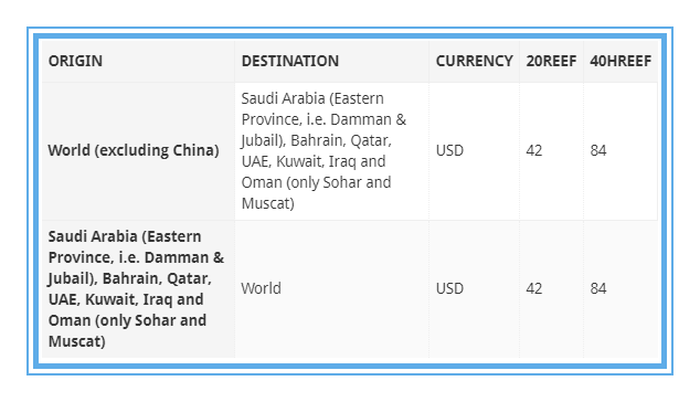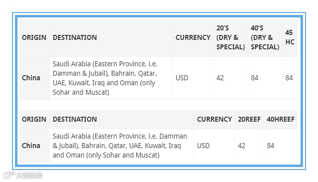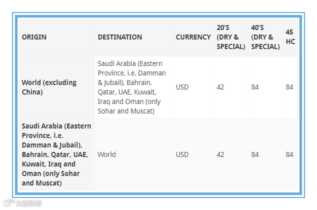 由于阿拉伯-波斯湾航运和物流活动的成本增加,马士基正在为所有进出沙特阿拉伯(伊斯特省,即达曼和朱拜尔)、巴林、卡塔尔、阿联酋、科威特、伊拉克和阿曼的货物(仅限索哈尔和马斯喀特港)引入海湾紧急风险附加费(GRS)。分别将于2019年7月10日(Non-Regulated corridors)和2019年8月1日(Regulated corridors)实施。