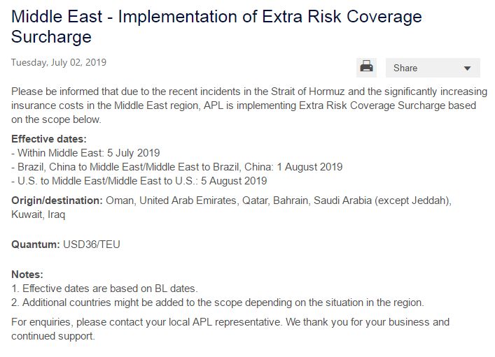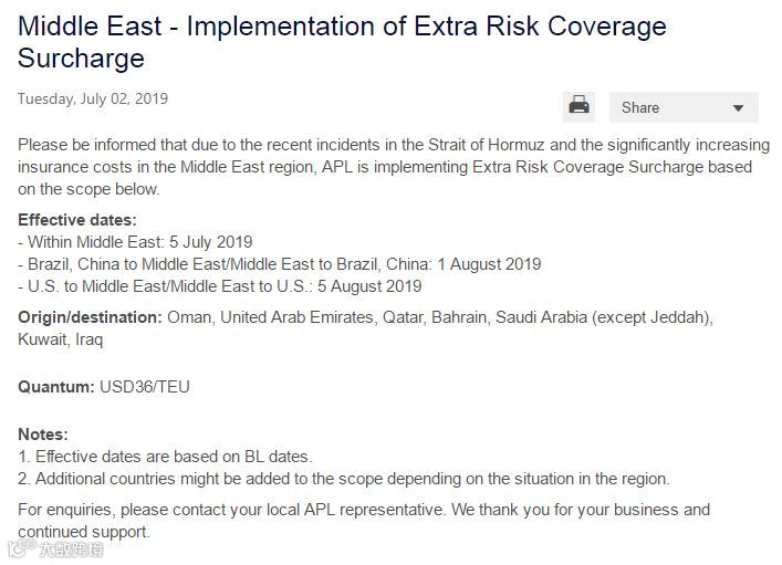 APL于7月2日宣布,由于中东地区保费增加,征收36美元/TEU的战争风险附加费。