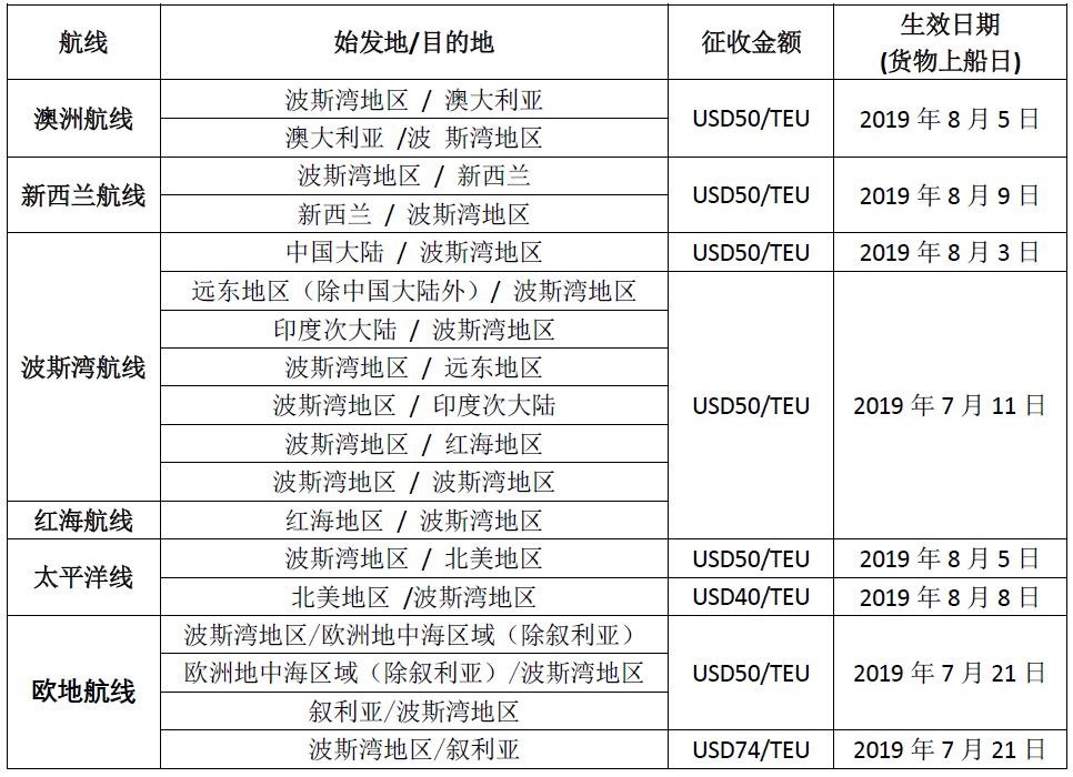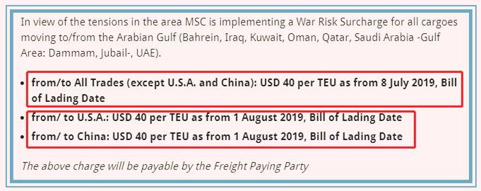 自2019年7月8日起至所有贸易航线(美国和中国除外)征收40美元/TEU战争风险附加费,而中国和美国自2019年8月1日起(提单日期)开始加收,同为40美元/TEU;上述费用由运费支付方承担。