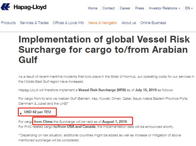 由于最近发生在霍尔木兹海峡的海上事件,hapago-lloyd在中东海湾地区的业务费用也增加了。因此,德国船务公司将于2019年7月15日起实施船舶风险附加费(VRS),具体内容如下: