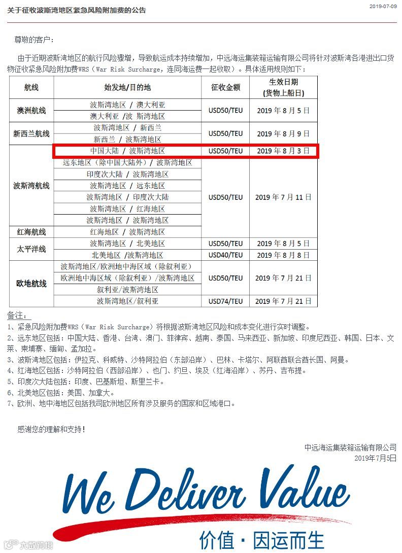 中远海运集装箱运输有限公司将针对波斯湾各港进出口货物征收紧急风险附加费WRS(War Risk Surcharge,连同海运费一起收取)。其中波斯湾航线的中国大陆至波斯湾地区自2019年8月3日(货物上船日)生效,征收金额:USD50/TEU。