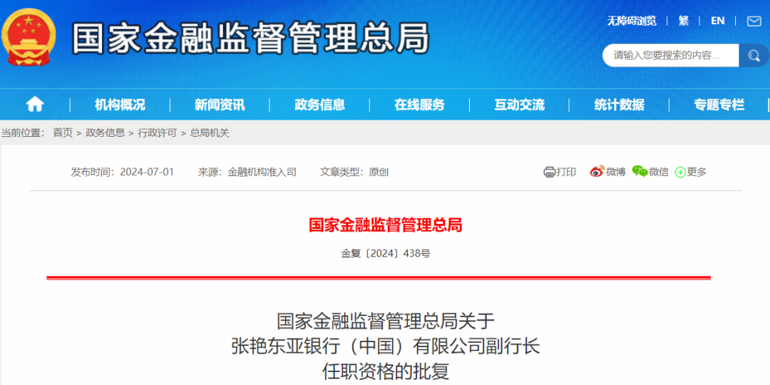 7月1日,金融监管总局网站发布的批复显示,核准张艳东亚银行(中国)有限公司副行长的任职资格。